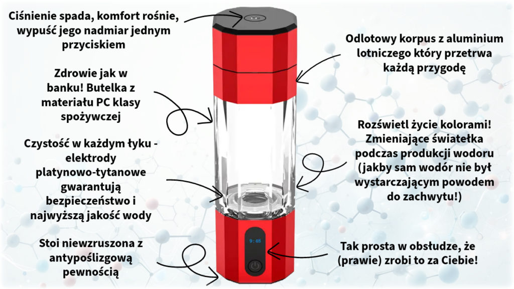 To unikatowe urządzenie to więcej niż zwykła butelka – to Twój osobisty generator zdrowotnych właściwości wody wodorowej, którą możesz cieszyć się w dowolnym miejscu i czasie.